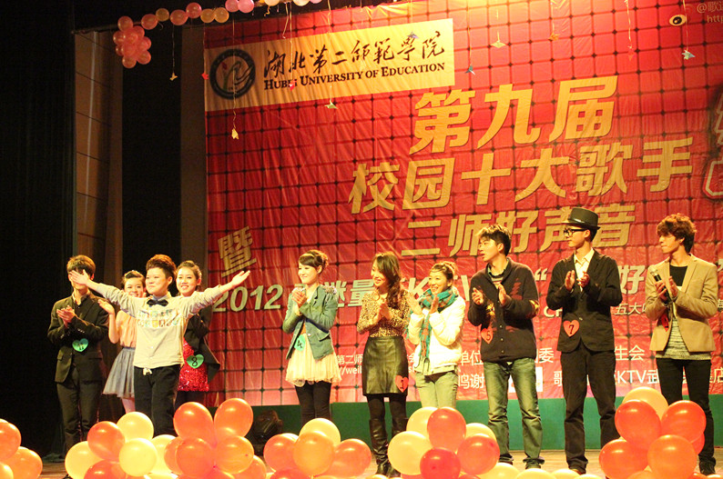 (艺术学院记者 谭欣) 12月5号下午六点半湖北第二师范学院第九届校园十大歌手总决赛暨二师好声音2012全国“歌迷好声音”校园选拔赛在万众期待、欢呼下正式拉开帷幕。本次比赛规则效仿《中国好声音》,由复赛成功晋级的24位选手以四名为一组,由六位导师带队为观众们带来一场不仅仅是视觉上的盛宴,更是一场激动人心、感人肺腑的精彩演出。为保证比赛的公平性与专业性,评委阵容也是非常强大,有艺术学院宋佳老师、赵丽娟老师及艺术学院舞蹈教研室主任谢池老师及湖北卫视《天下同名人》栏目组编导张鹏等。同时本次比赛还邀请到武汉音乐学院、湖北经济学院等来自武汉市20多所高校的代表团来为二师好声音加油助威。
