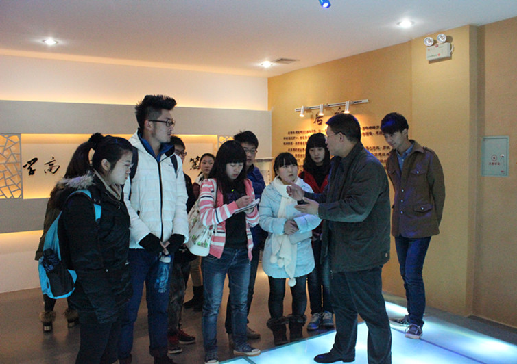 据邢书记介绍,校史馆的设计有非常高的文化底蕴。整个校史馆的设计灵活运用了“水文化”,带有荆楚文化的元素;此外,引用《礼记•大学》中的内容以及42种不同字体的“师”充分体现了“大学”的概念。“每一所学校的发展都必须立足历史、尊重历史,同学们也要用艺术的眼光去感受、学习学校的文化。”邢书记表示。