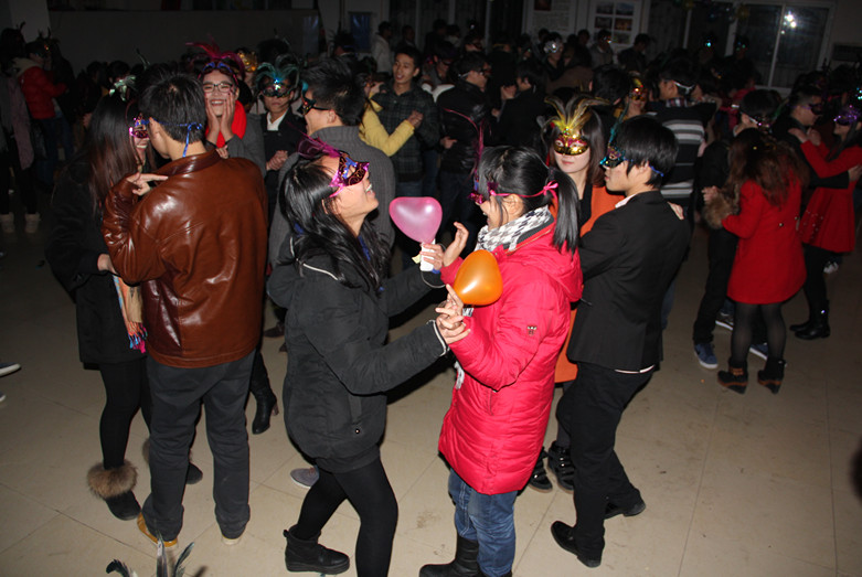 5点30分,一楼大厅氛围已浓,还未吃晚饭的工作人员都在进行场地的布置,接受记者的采访时,他们表示,很期待等下舞会的开始,场地布置完毕,他们也会换上自己准备的服装,参加这次假面舞会。6点左右,一楼大厅已经排起长队,同学们都精心打扮,并且戴着面具,拿着发到的号码牌准备入场。随着动感的音乐,敢敢乐队演奏的《自由》将现场气氛带动起来。随后,进入了第一个环节,集体交际舞蹈,男同伴们纷纷邀请女同伴们步入舞池,节奏明快的音乐、优雅娴熟的舞姿,整个会场营造着一种温馨和谐的气氛,同学们都认真并积极参与其中。在接近3分钟的交际舞之后,开始了游戏环节,包括抢舞伴、撕纸条、七拼八凑等。活动过程中,刑宽广老师、杨亚男老师、李茜老师及李京老师与同学们配合默契,不仅与同学们一同步入舞池,还主动参与游戏活动,与同学们进行了很好的互动,引来了同学们的阵阵欢呼。最后,舞会以男女互动跳舞的形式在音乐声中落下帷幕。