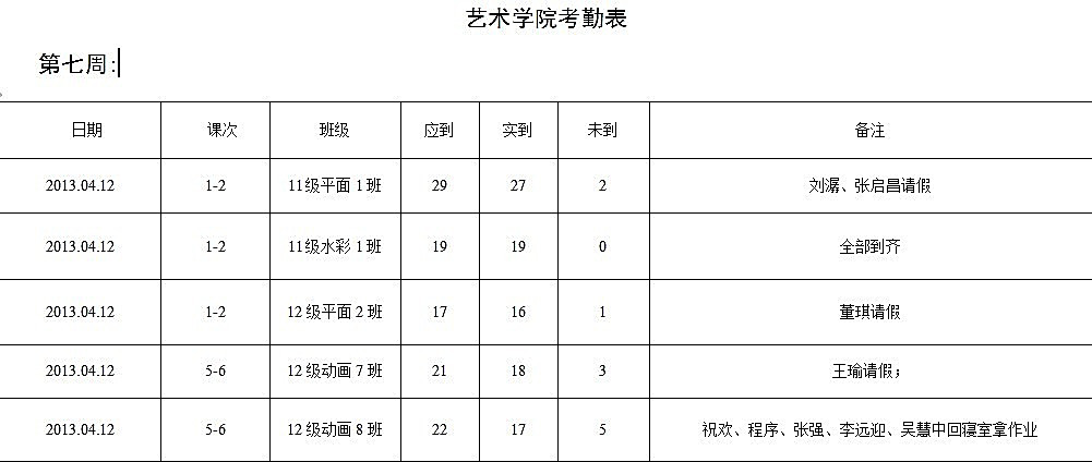 艺术学院第七周星期五12级学生课堂考勤检查情况汇总表