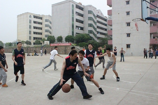 运动鞋、专业篮球服,以张绍明为首的平均年龄45岁的“老师队”队员摩拳擦掌。随着裁判哨声响起,球被高高抛上,双方队员一跃向上。张绍明弯着腰,篮球在他的手下前后左右不停地拍着,他与队友不断眼神交流,寻找“突围”机会。突然他加快了步伐,一会左拐,一会右拐,冲过了两层防线,来到篮下,一个虎跳,转身投篮,篮球在空中划了一条漂亮的弧线后,不偏不倚地落在筐内。副院长陈顺桥也自如地在赛场穿梭,左躲右闪,机智地做假动作,使学生队扑了个空。上半场第一段比赛,“老师队”以16:2遥遥领先。“学生队”不甘示弱,奋力“拼杀”,下半场局势渐渐扭转。跃起,抬臀,压腕,高个子学生大步流星接住球,冲到篮筐下,凌空而跃,将球送进篮筐。下半场最后一段,为保存战果,老师们在一起互打暗语,交递眼神,准备采用拖延战术,最后却防守有误,被学生连进几球,在最后的十几秒里以3分微差战败。