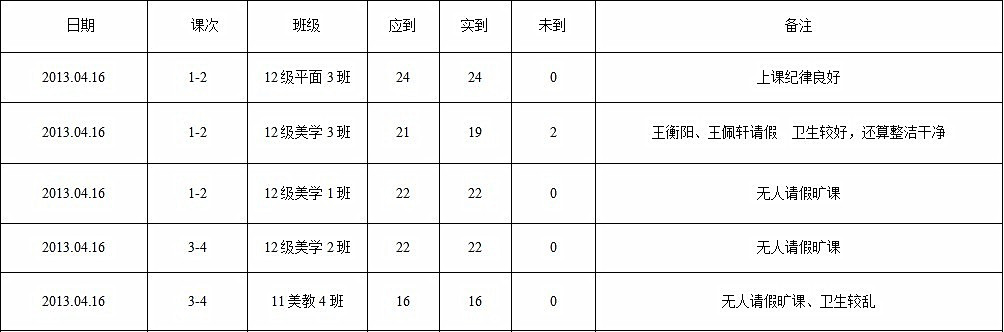 艺术学院第八周星期二12级学生课堂考勤检查情况汇总表
