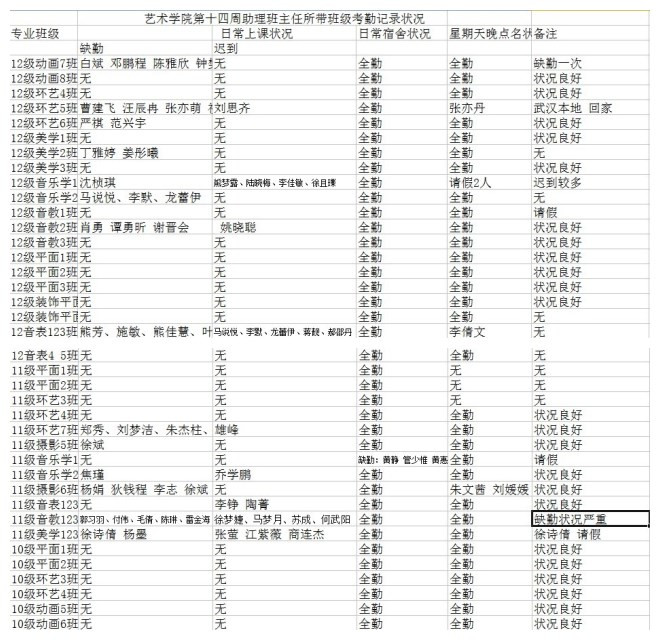 艺术学院第十四周助理班主任所带班级考勤情况