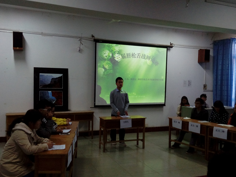 (艺术学院见习记者吴梦美)2013年11月15日湖北第二师范学院艺术学院唇枪舌战辩论赛在210教室举行。为建设我院优良学风,丰富同学们的课外活动,培养大家的思辨能力和语言组织能力,艺术学院团学联成功举办了一年一届的辩论赛。