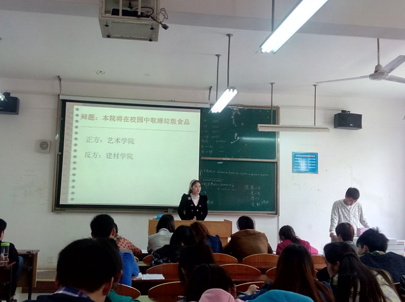 此次辩论赛采用了BP赛制,由正方担任执政党,反方担任反对党。在这场比赛中,是由艺术学院对战建材学院,艺术学院担任执政党,辩题为“本院将在校园中取缔垃圾食品”。比赛开始后,双方分别站在自己的党派中向对方发起了进攻,执政党内阁更是以自己的身高来说明食用垃圾食品的坏处,场下各位双方赛场大有群雄舌战的气势。