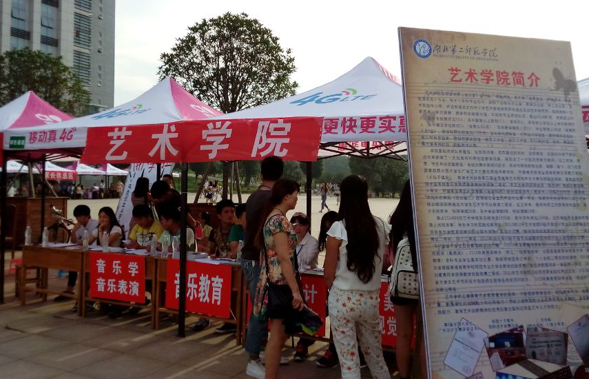 9月4号7时,艺术学院迎新工作报到组成员在设于新图书馆前与西区篮球场的两处新生报道点集合。在布置好迎新场地后,便投入了紧张的迎新工作。