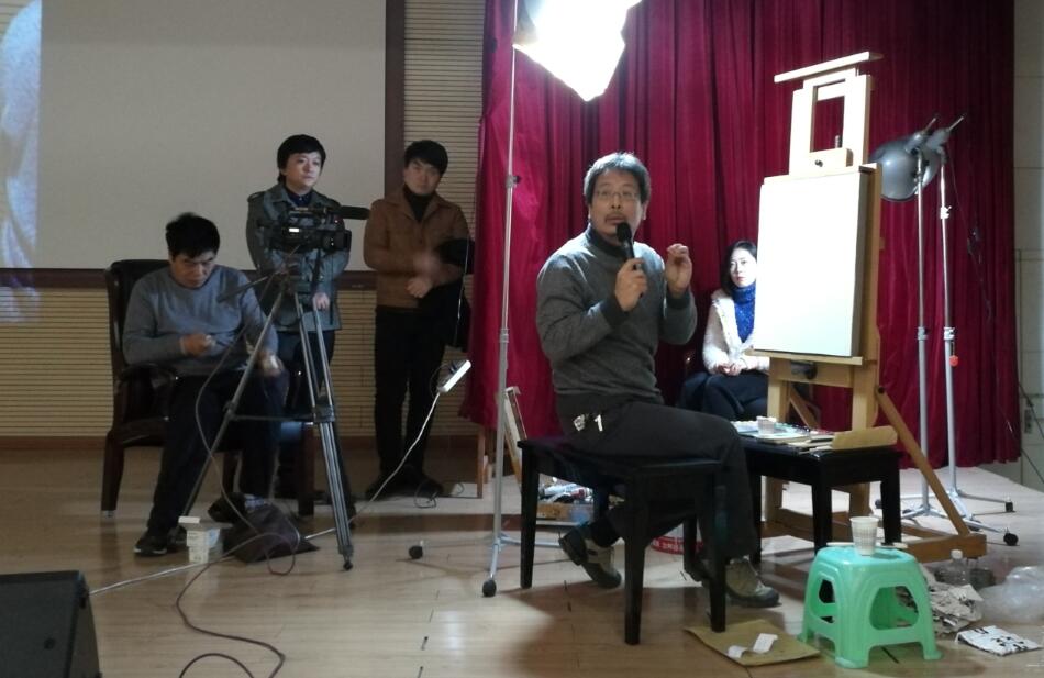 介绍完毕后,冷军老师正式作画。作画过程中他边讲解边示范,一上午的时间在同学们的屏息凝神注视中很快就过去了。下午两点冷军先生继续完善细节刻画并作画面最后调协。冷军先生强调,“色彩是油画最大的优势,有好看的色彩才有好看的油画。色彩的透视关系及纯度表现是照相机无法捕捉的,只能依凭画家肉眼感知并加以表现。”