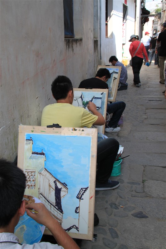 学生在外写生很不容易,除了许多花销是自费,而且生活上也要能吃苦。在宏村,由于来这里写生实习的学生多,因此每天找一个好位置写生很重要。学生们一大早就到南湖边抢占有利地形,摆开画板,聚精会神开始作业。围着南湖,周围密密麻麻坐满了学生。尽管湖边游人如织、喧哗嘈杂,学子们专注于眼前悠久的文明、自然的风光,潜心作画,一点儿也不受影响。通常情况下,学生们自备中餐,他们或者带着馒头、饼干,或者是在街边买一点食品对付一餐。天气炎热尚能坚持,如果忽然变天,在外遭到雨淋,全身湿透也是常事。