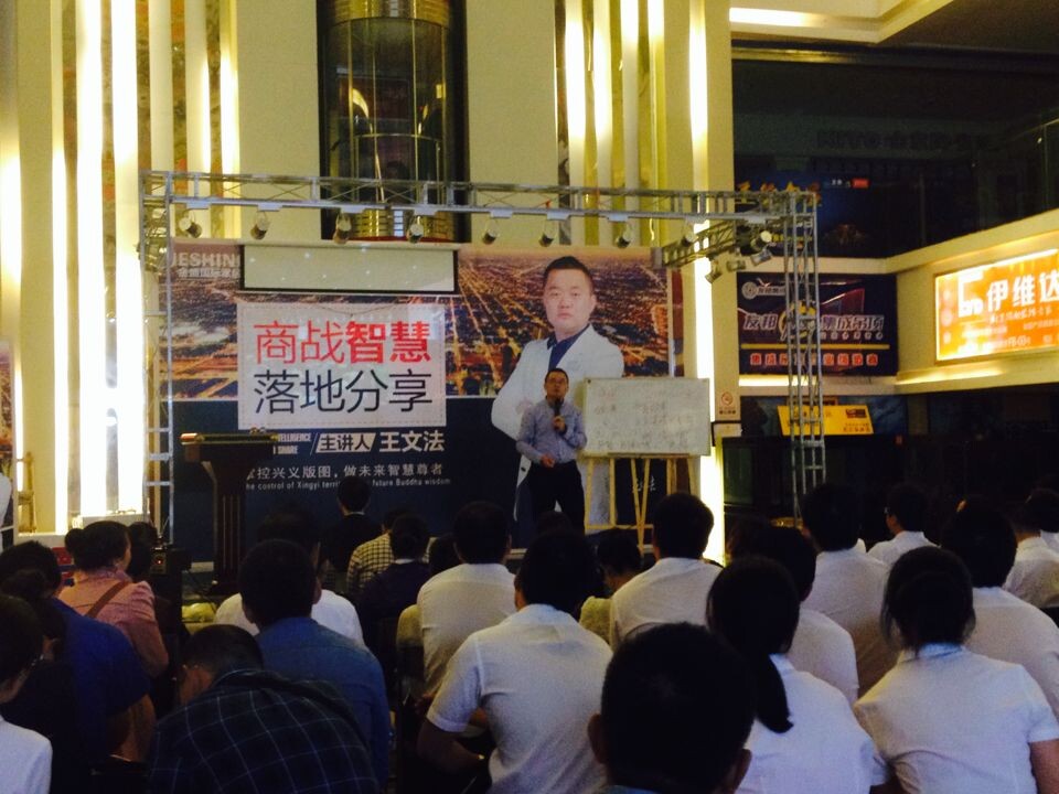 2014年10月14日晚,在金盛国际家居友谊广场地下一楼举办了慧百商战智慧落地分享会。本次商战智慧落地分享会由金盛国际家居武汉分公司举办,主持人武汉市超越巅峰培训有限公司总经理刘林,分享会嘉宾中国教育培训界排名第二名冯晓强老师的六强弟子---湖北省慧百商战协会会长王文法(和室创意装饰有限公司总经理),参会人员有金盛国际家居华中区域李总经理、金盛国际家居武昌商场总经理鲁总、副总欧阳广明、汉口商场总经理罗总、财务部总监、市场部总监、策划部总监、物管部总监、湖北文化产业中心成员周玲、其他建材行业老板、金盛国际家居武汉市2家商场60多位中高层员工等参加培训。