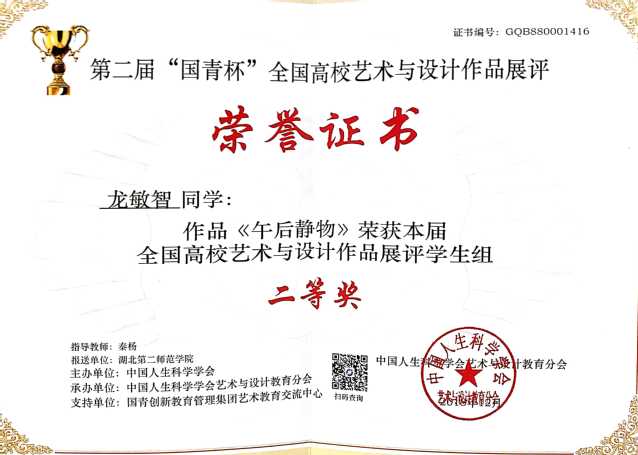 本届“国青杯”全国高校艺术与设计作品展评大赛是由中国人生科学学会主办,中国人生科学学会主办是由中华人民共和国教育部主管,民政部注册的国家一级社团。