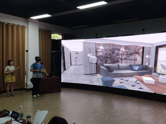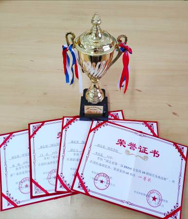 在项目展示环节,李欣茹同学介绍方案、邵志文同学佩戴VR设备演示、闫宾同学操作电脑,3位同学合作完成了5分钟的精彩展示。经过专家现场评比,我院参赛团队作品在众多作品中脱颖而出,获得装饰VR组别一等奖。