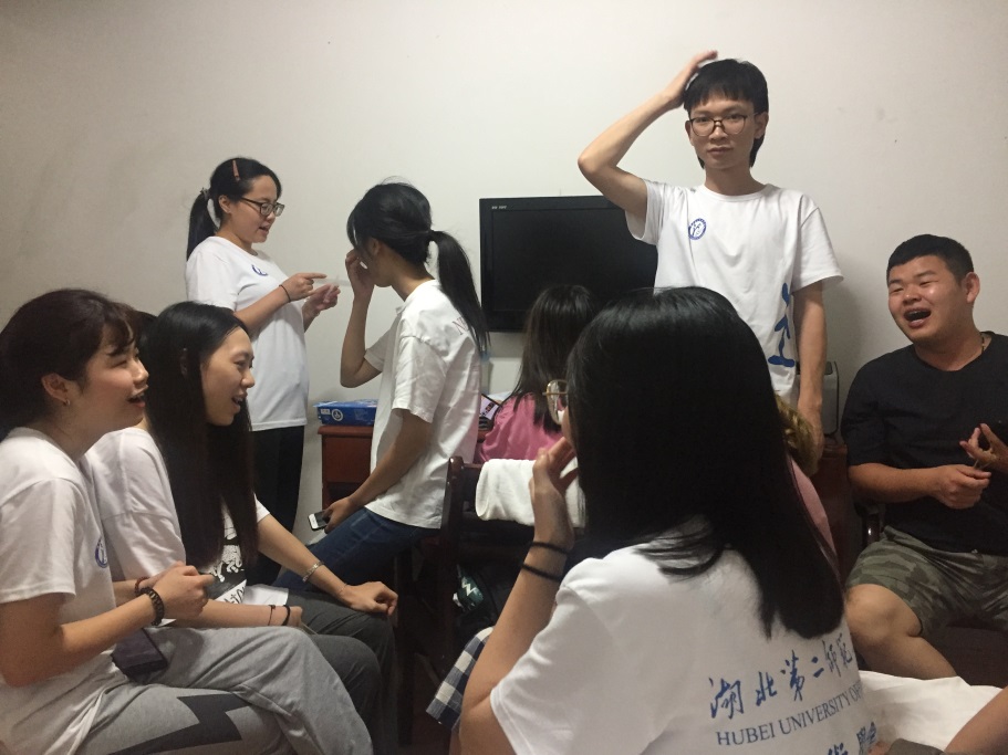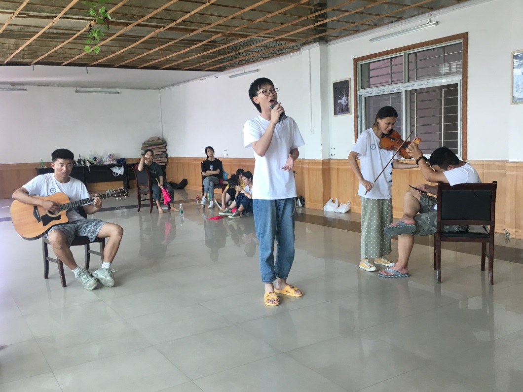 晚上,房间里又传来一阵又一阵的歌唱声和笑声。走近瞧瞧,原来是争取了广大村民的意见后,大家决定想办法使整场晚会更接地气,让百姓们更喜闻乐见!大家七言八语,在节目单中加入了戏曲唱段这样一种贴近于生活的艺术形式。男生不断突破自我,反串各种女生唱段;女生也毫不示弱,挑战更高的难度。大家笑作一团,积极讨论着更好的搭配方案,选取优秀的、更具有表现力的同学参演。
