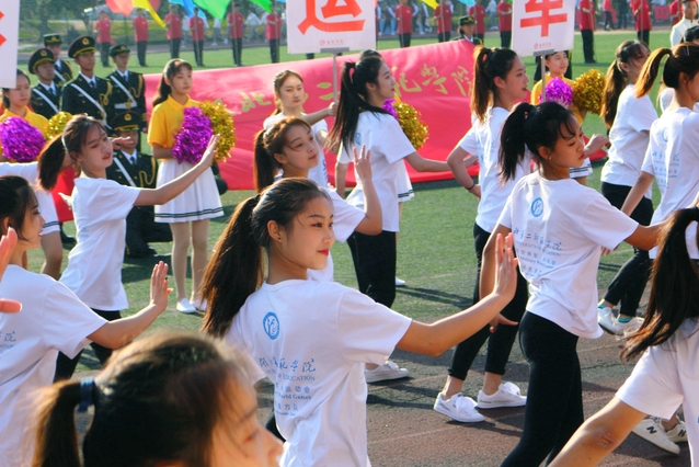 2019年10月31日,湖北第二师范学院于田径场举行2019年体育文化节暨秋季运动会。上午8点30分,运动会开幕式正式开始,各学院代表组成的方队纷纷走向主席台接受检阅,艺术学院的方队是由艺术学院参加第七届世界军人运动会的演职人员组成的,他们举着“助力军运彰显二师”的牌子昂首阔步走到主席台下方接受检阅。