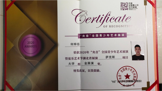 本网讯(通讯员张珊珊)12月18日,艺术学院2019级音乐与舞蹈学专业何梓岳同学代表湖北第二师范学院参加 “央音”全国青少年艺术展演管弦乐艺术节,荣获湖北省展演萨克斯项目大学组“金展演” 奖。