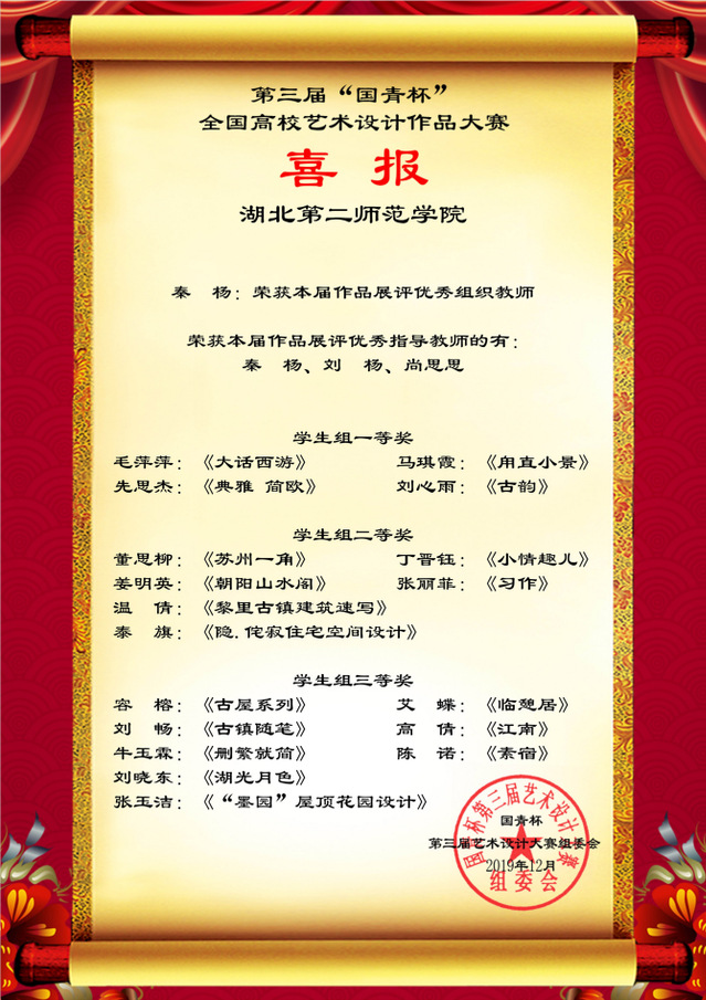 环境设计专业2017、2018、2019级共18名学生分别荣获学生组一、二、三等奖,青年教师秦杨、刘杨、尚思思荣获本届大赛优秀指导教师。