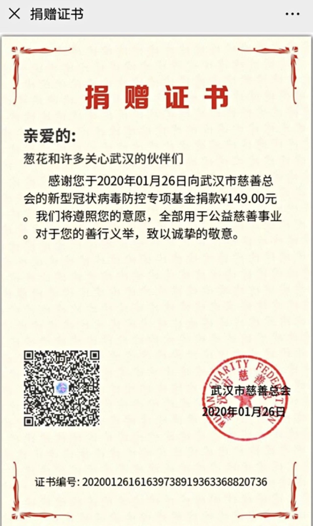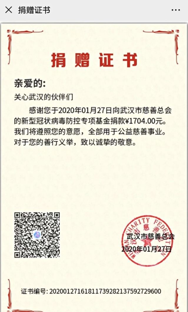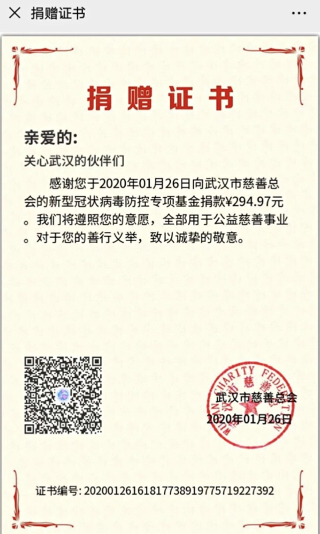 赵狄艺:在这个期间让我感动的应该是每一个人,每一个人有过宣传,集资,查询信息的人,还有支持我的家人。我觉得每个人都挺让我感动的,当发了空间的第一天搜集到了一千七,朋友们的集资宣传、还有好多大学同学也在一起帮忙宣传、甚至未曾谋面的网友也纷纷伸出援手,他们对我说:“武汉加油!这是我的心意。”当时真的很感动。还有最想感谢的一位网友,是追星群里提了一句然后她来加我微信,第一次给了我79然后说有了压岁钱继续集资。大年初一凌晨两点她发了666元然后推了几个朋友的微信给了我,然后她和朋友们一共捐了一千多,就觉得很感动的事。我们甚至都不是好友,但是却互相信任,也是从这次活动我们成为了朋友,我觉得应该感谢每一个人,真的很谢谢大家。