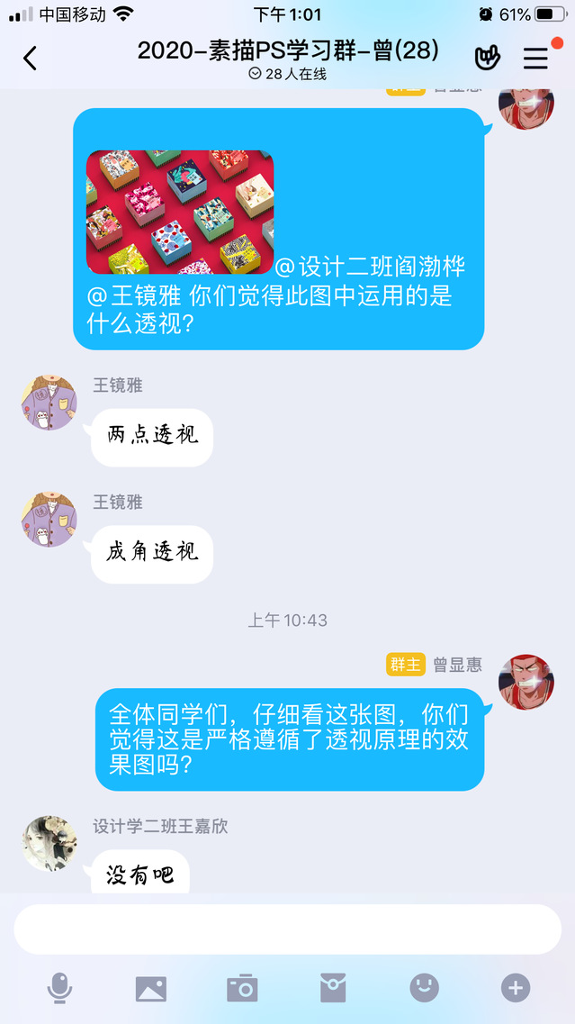 以下图片是三位教师集体备课讨论、课上主题讨论,以及来自19设计1班谭淑梅,19设计2班肖安琪、龚添怡、刘翠梅、王镜雅的作品。“停课不停教、停课不停学”,师生共克时艰在行动!