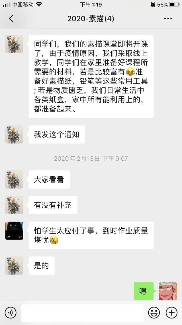 本网讯(通讯员 鲁红梅)转眼间,网络教学已经进行到了第三周,在过去的两周里,艺术学院视觉传达系青年教师鲁红梅、于芳、曾显惠为了上好《素描》这门课程,绞尽脑汁。身处疫区的师生面对一无教材、二无工具的现实,所谓巧妇难为,大概如此吧!三位老师考虑到教学物资的匮乏,利用网络资源,为同学们准备了大量的绘画素材、理论资料;同时,隔空示范如何制作绘画工具。没有铅笔,老师为同学们演示自制炭笔。没有纸张,师生一起想办法,废物利用,在家寻找各种能利用的材料,可谓苦心积虑。