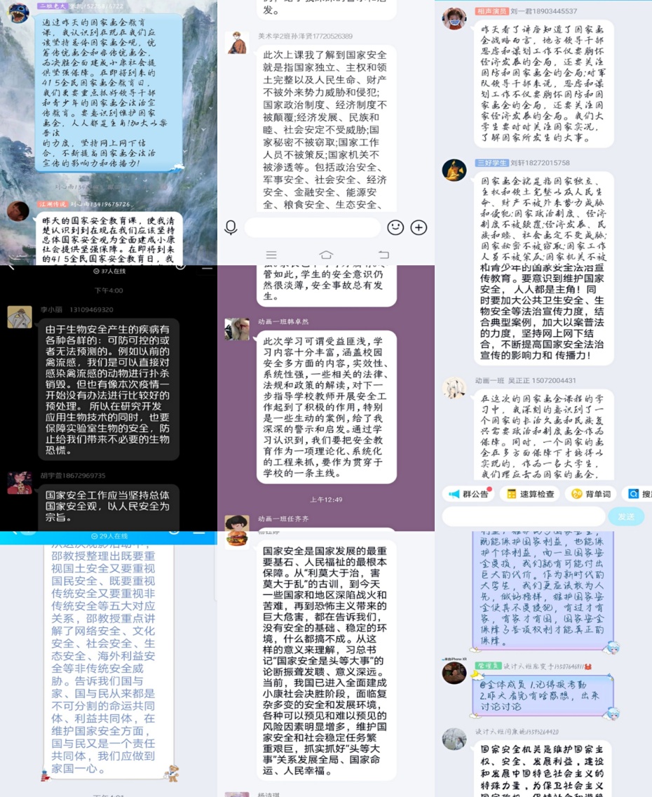 (本网讯通讯员 骆夏君)4月15日是中国第五个全民国家安全教育日,正值全球人民共同抗击新冠肺炎的特殊时期,艺术学院师生积极响应教育部3000万大学生同上堂全民国家安全教育日高校公开课的要求,组织全院师生在线学习,并且组织开展线上讨论、答题、线上倡议等一系列活动,积极上好“国家安全教育”这一课。