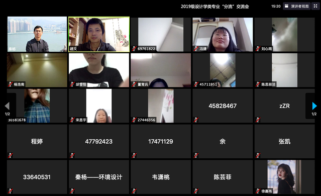 此次“分流”工作本着对学生未来发展负责的原则,通过前期专业导论、线上问卷与统计、瞩目会议平台答疑等环节逐步推进的。瞩目线上会议答疑交流活动首先由两位主任分别对各系情况、专业方向设置、学习方法作了重点介绍,也以2020届毕业设计作品为例直观呈现了视觉和环境设计设计专业。再通过在线学生留言提问、两位主任分专业逐一解答,问答环节持续1个多小时。