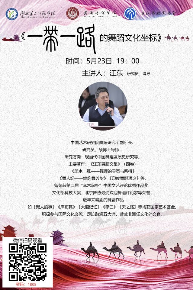 讲座伊始,江东老师对受邀参与此次讲座感到十分光荣和激动,为疫情下武汉广大师生加油!讲座中,江东老师以一带一路为背景,详细梳理了北线、中线、南线、中心线上多地舞蹈发展历史与前沿动态,如北线俄罗斯的芭蕾舞、民间舞,日本雅乐,韩国舞蹈,中线哈萨克斯坦、匈牙利舞蹈;南线越南、马来西亚、印度尼西亚、斯里兰卡、印度舞蹈,以及中心线上的西班牙舞蹈。