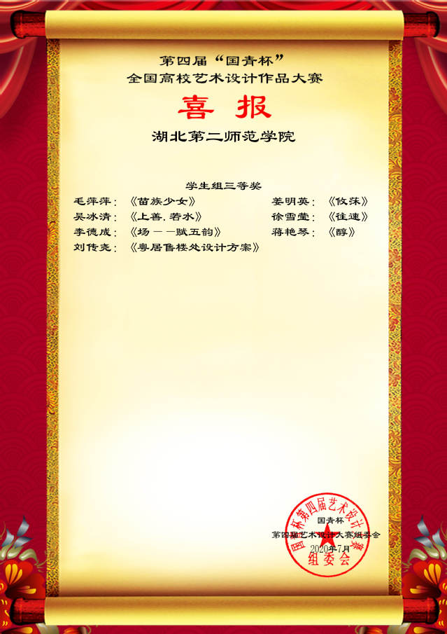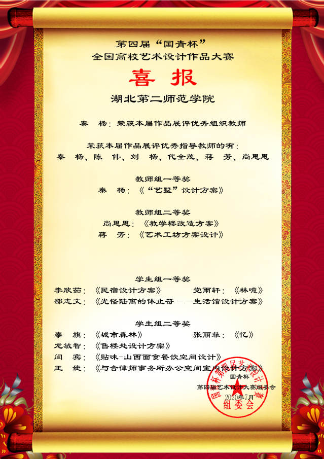 环境设计专业各年纪共15名学生分别荣获学生组一等奖三项、二等奖五项、三等奖七项,教师秦杨、蒋芳、尚思思分获本届竞赛教师组一等奖一项、二等奖两项。教师秦杨、陈伟、刘杨、代全茂、蒋芳、尚思思获本届竞赛优秀指导教师。