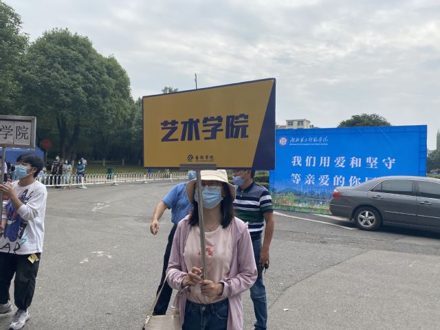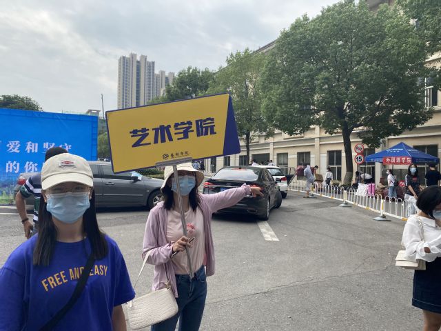 图4、图5:骆夏君老师举艺术学院迎新牌欢迎新生