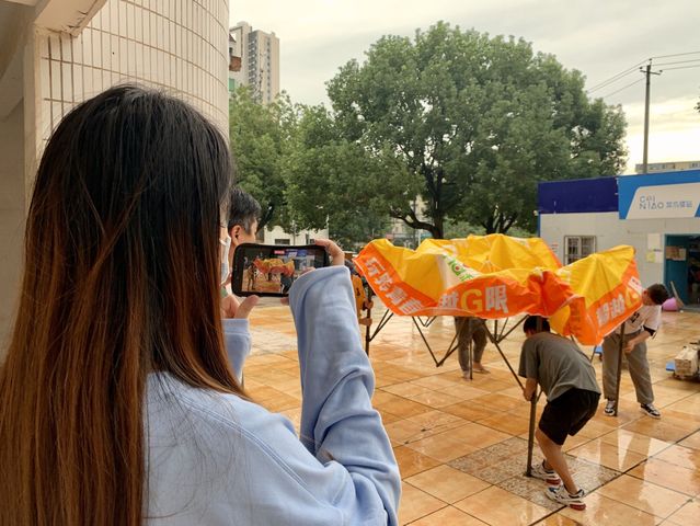 虽然天公不做美,绵绵细雨,地面湿滑,但是艺术学院学生组织尽心尽力搭起了报道点的雨棚,为初来乍到的新生们指引方向。