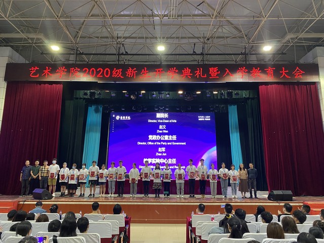 会议期间,刘畅副院长宣读了《关于艺术学院2020级助理班主任聘任决定》,副院长赵文、党政办公室主任赵军、教学实验中心主任王力为2020级助理班主任颁发聘书,合影留念。为同学们的大学学习生活实践提供了全面的建议。毕业学生代表李亚楠对学校及老师表示感谢,对学弟学妹提出珍惜时间努力生长的希望。勉励2020级艺术学院全体新同学应当志存高远,自信、自律、自强,学会规划好自己的时间,在大学这个舞台尽情地展现自我,使自己变得更加优秀。教师代表欧阳亮讲话回顾往昔,欢迎新生的到来并激励学生们勤奋学习,珍惜时间。