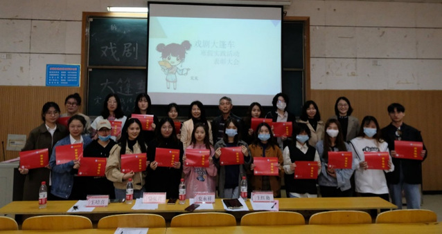 本网讯(通讯员 王培喜)3月25日,2021年寒假戏剧大篷车社会实践表彰大会在八号阶梯教室顺利举行,艺术学院党支部副书记夏永祥、戏剧大篷车负责人王培喜老师、艺术学院分团委骆夏君老师、艺术学院王红艳老师出席表彰会。本次大会主要对戏剧大篷车寒假社会实践优秀团队及个人进行表彰,并针对此次社会实践活动进行总结。