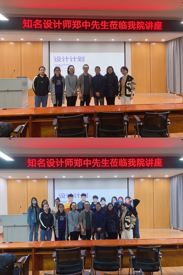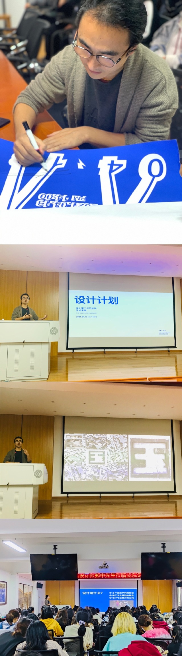 郑中老师首先从近几年所做的设计计划展开分享,通过设计观察、社会现象、现场在地等设计的实验,传递出设计本身是对本身欲望的设计。告诉了学生如何进行敏感力的训练,以及通过思维方式发送转变,用跨学科解决视觉设计。随后与学生互动发问:设计是什么?设计不是什么?进行了互动交流,引入何谓设计计划,有目的性的计划,在线索和脉络中实现,是一个设计方法。设计永远不是自然,但永远想干预自然,要从自然中寻找合理的自然。
