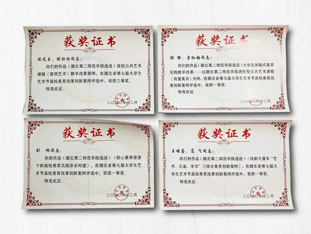 艺术学院教师在本届大学生艺术节美育创新案例获得九项嘉奖。王培喜、高飞老师的《戏剧大篷车“艺术、公益、学术”三结合美育创新案例》、谢敏、鲁红梅老师的《大学生体验式美育实践教学改革——以湖北第二师范学院进阶式公共艺术课程<我爱美衣>为例》以及刘畅老师的《核心素养背景下的高校美育实践体系构建》获高校美育改革创新案例一等奖。罗莉、王超、程荣洁、赵文老师获得高校美育改革创新案例二等奖。陈元玉、程欣怡老师获高校美育改革创新案例三等奖。