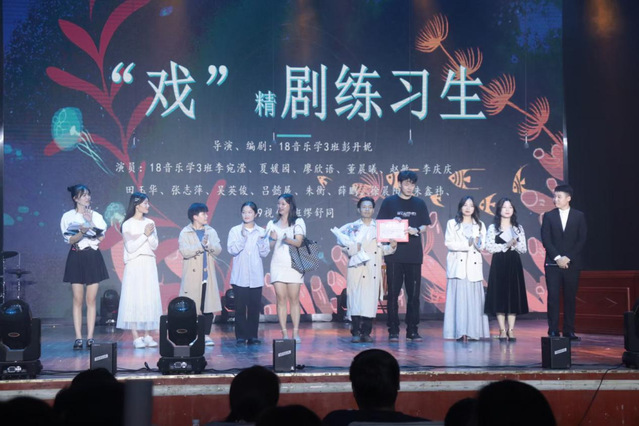 图为18级音乐学3班由彭丹妮导演、吴英俊等主演的情景模仿剧《戏精剧练习生》