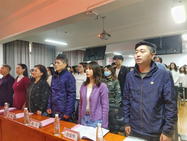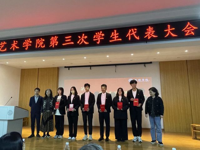 大会正式开始后,全体与会人员起立,奏唱国歌。其后,由艺术学院党委书记雷静和老师致开幕词。数学与经济学院致贺信,校学生会主席致辞,并为艺术学院第五届学生会主席团颁发聘书、为艺术学院第五届学生会优秀部长颁发聘书。
