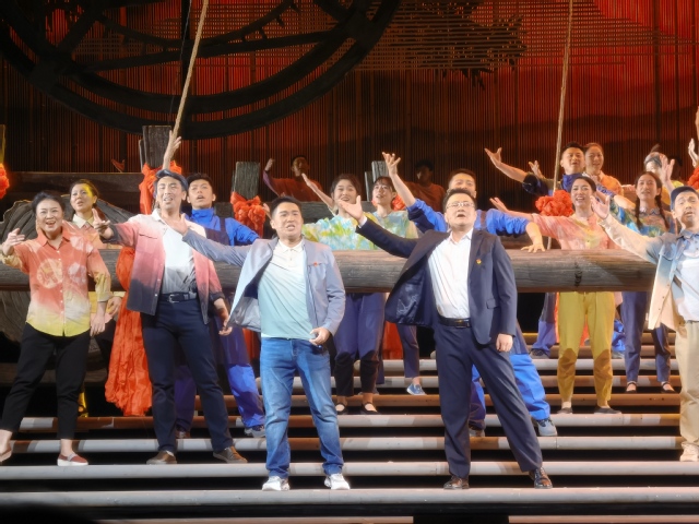 民族歌剧《山茶花开》演出,第一排左一为罗京