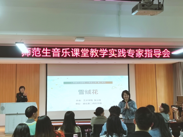 本网讯(通讯员 张珊珊)11月15日下午,师范生音乐课堂教学实践专家指导会在9210学术交流中心举行。本次交流会特邀请武汉市教育科学研究院音乐教研员、教育部“一师一优课”评审专家、教育部基础教育课程教材发展中心专家、国家艺术基金会专家、人音社教材培训专家、湖北省“荆楚卓越教师协同育人计划”项目特聘专家胡晓燕教授。指导会由音乐学专业负责人欧阳亮教授主持,音乐学专业教学法团队教师现场学习,20音乐学专业学生现场观摩。