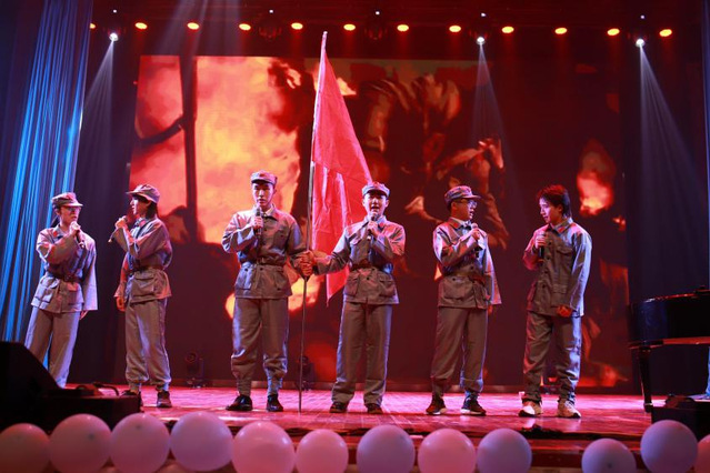 图为张添宇、郝锐星、郭家乐、龚泓之、赵世玉、田成带来的小组唱《在太行山上》