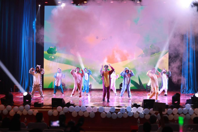 图为由姚婧灵、刘思辰、侯雨诗、柳洪雨、李娜、马盼荣、张添宇、田成、郭家乐、赵世玉带来的歌舞《NEW BOY》