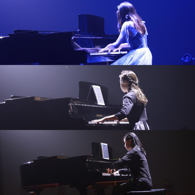 图为由柳洪雨、刘思辰、姚婧灵带来的钢琴串烧《我们的大学时光》
