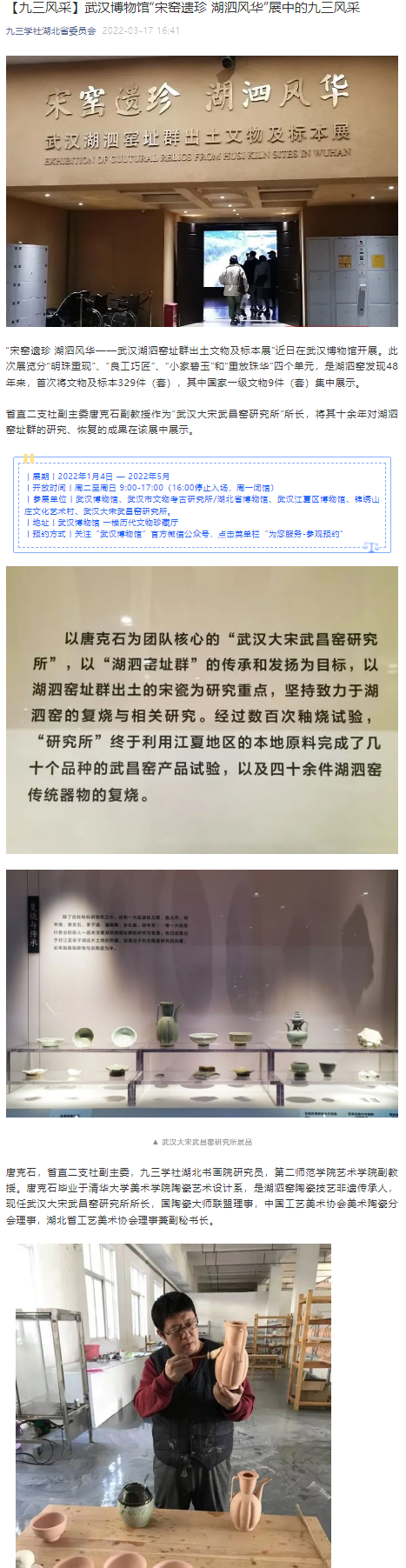 本网讯(通讯员:唐克石)近日,九三学社湖北省委员会官微报道了,艺术学院动画专业负责人,唐克石副教授团队研究成果在武汉博物馆展出事迹。后期,动画专业的信息化美育团队将运用扩展现实技术,把“武汉大宋武昌窑研究所”的成果,转换成学校美育课程中优秀传统文化的特色内容推送给学生。