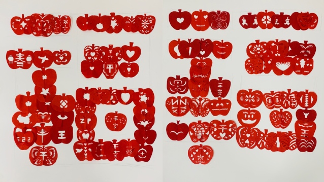 程老师与吕老师在本次课程分享过程中还设计了中现场实践环节,吕老师在线上抛出剪纸体验任务,并详细的讲解内容和要求,限时要求学生剪纸互动海报。苹果代表平安果、福果,每位同学在剪出的苹果形态中,再自由剪出心中认为的与福有关形态,最后大家将福果组合一起形成福字。程老师在教室组织和指导学生完成2组任务。线上线下两位老师思想意识统一且默契,程老师对教室现场节奏、指导场控到位。