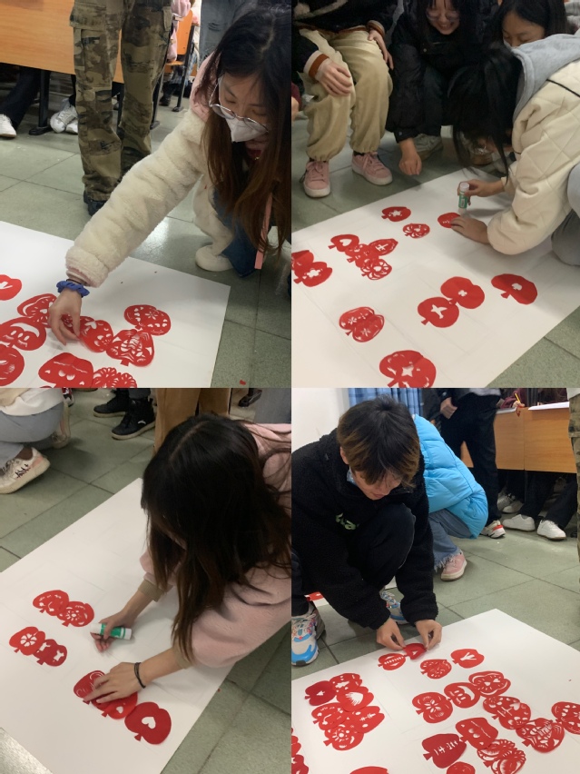 程老师与吕老师在本次课程分享过程中还设计了中现场实践环节,吕老师在线上抛出剪纸体验任务,并详细的讲解内容和要求,限时要求学生剪纸互动海报。苹果代表平安果、福果,每位同学在剪出的苹果形态中,再自由剪出心中认为的与福有关形态,最后大家将福果组合一起形成福字。程老师在教室组织和指导学生完成2组任务。线上线下两位老师思想意识统一且默契,程老师对教室现场节奏、指导场控到位。