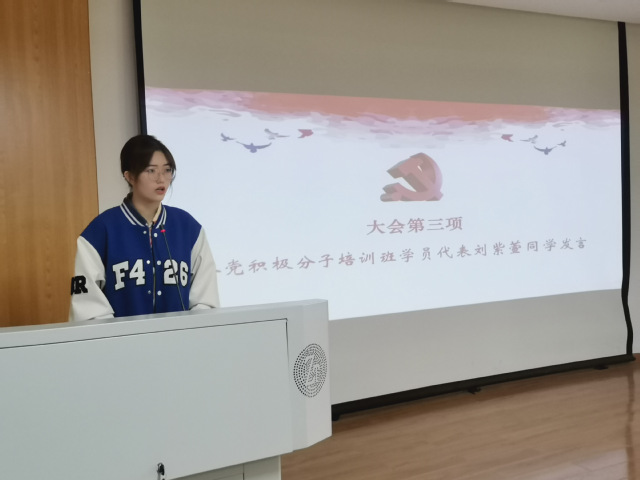 大会第三项由入党积极分子代表刘紫萱同学发言,刘紫萱同学代表全体学员郑重承诺:严格遵守党校培训纪律,珍惜学习机会,努力锻炼自己,提高自己,坚定党的信念,树立远大的共产主义理想,力争学有所思、学有所悟、学有所得、学有所获,出色地完成这期党校培训班的学习!