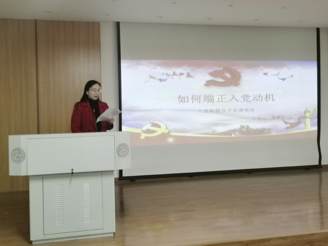 开班仪式后,雷静和书记为学员们讲述了党校第一课——《如何端正入党动机》。雷书记由中国共产党的三大历史贡献入手,回顾了中国共产党的百年征程,呼吁大家要有坚定的政治立场和政治思想,以实际行动争取早日入党,担当起党赋予新青年的责任与使命。