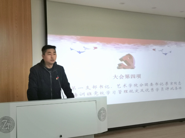 大会第四项由艺术学院第一党支部书记、艺术学院分团委书记李京宣读了《党校学习管理规定和优秀学员评比条件及考核办法》。他讲到,党务工作是学院工作的根本,是学院各项工作得以顺利开展的基础,希望广大学院在党校学习期间踏实努力,认真学习,做好笔记,向中国共产党靠拢。