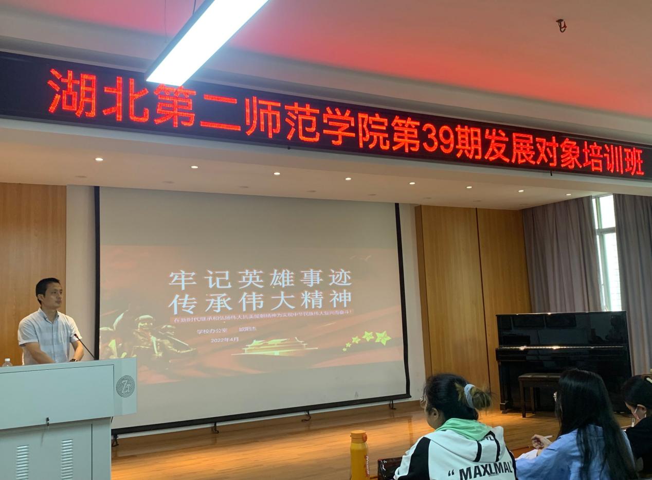 本网讯(通讯员 王红艳 刘紫萱)2022年4月27日中午 12:20湖北第二师范学院艺术学院分党支部第39期发展对象培训班在九号楼9210顺利开课,本次课程由学校办公室副主任欧阳杰老师围绕《牢记英雄事迹,传承伟大抗美援朝精神》进行授课。