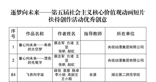 本网讯(通讯员 付丹)国家广播电视总局办公厅关于公布“逐梦向未来——第五届社会主义核心价值观动画短片扶持创作活动”优秀创意的通知,内容如下: