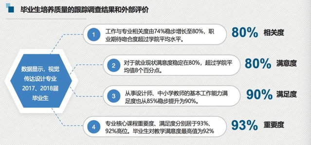 依据《麦可思应届毕业生培养质量评价报告》,视觉传达设计专业毕业生主要职业类型集中在设计师、中小学教师,突显专业人才培养的“双师”“双证”定位准确,具有专业实践能力强、师范生综合素质好的特点。数据显示,视觉传达设计专业近届毕业生对“工作与专业相关度”,由74%稳步增长至近80%,职业期待吻合度超过学院平均水平;对于就业现状满意度稳定在80%,超过学院平均值8个百分点;从事设计师、中小学教师的基本工作能力满足度也从85%稳步提升为90%。反映了专业教学过程中十分注重结构性知识教授、实践技能和职业能力培养,毕业生对教学满意度最高值为92%、一次性就业率为90%。