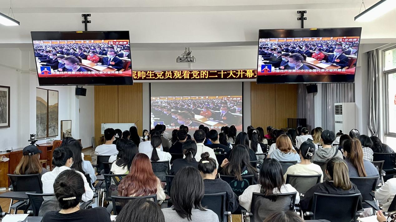 本网讯(通讯员 黄羽彤)10月16日,中国共产党第二十次全国代表大会在北京人民大会堂开幕。艺术学院党委积极组织我院师生党员、群众通过集中和自行观看的方式认真收听收看党的二十大开幕盛况,聆听习近平总书记代表第十九届中央委员会向大会所作的报告。本次集中观看设置党员会议室和9210两个会场,艺术学院领导班子,教师学生党员共计200余人到现场集中观看,千余人线下自行观看。
