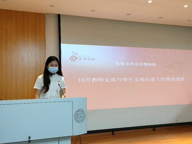 在党务公开与支部建设活动部分,学生党建助理厉文轩与陈佳汇报了在教师支部与学生支部共建过程中的收获,他们表示通过参与各项党务工作,极大的提升了自己的综合能力,也提高了党性修养。以后会继续努力,积极工作、快速成长。